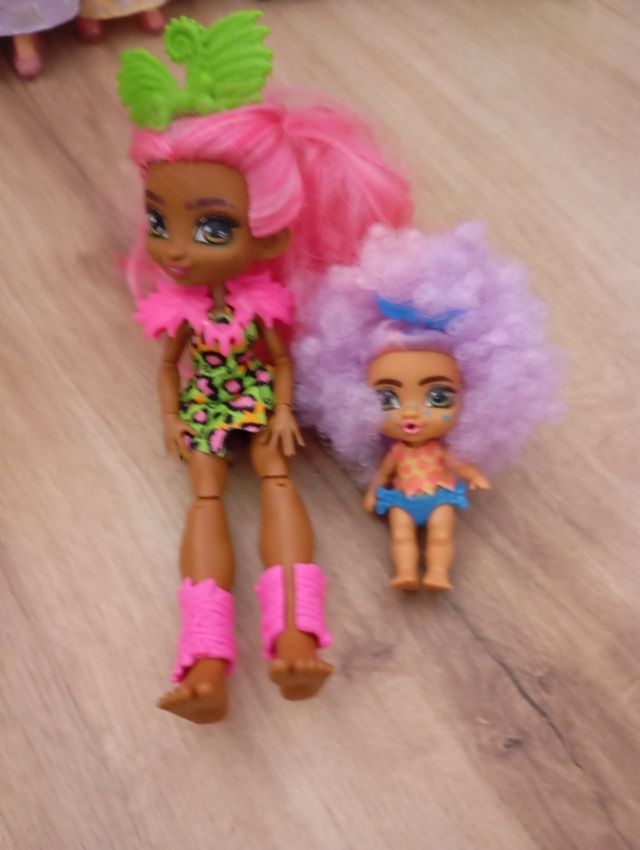 Detalles del productoDos muñecas de colección, una de ellas más grande que la otra. La muñeca más grande tiene el pelo rosa y un atuendo de inspiración cavernícola. La muñeca pequeña tiene el pelo morado y un pañal azul. Ambas muñecas están en buen estado y listas para jugar.