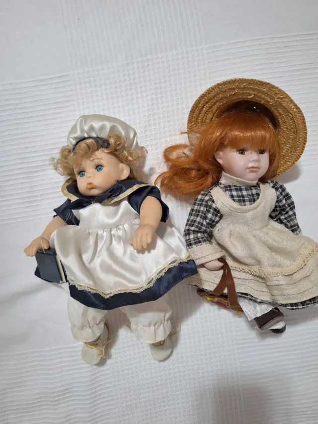 Detalles del productoConjunto de dos muñecas de porcelana con atuendos detallados.