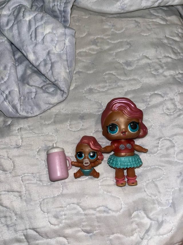 Detalles del productoPreciosas muñecas LOL Surprise, dos hermanas. La muñeca más grande viste falda y top. La más pequeña lleva pañal. Incluye biberón rosa. Están en buen estado. - 2 muñecas LOL Surprise. - 1 biberón.