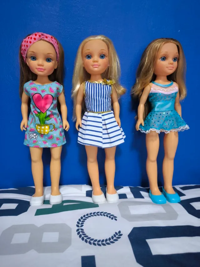 Detalles del productoConjunto de tres muñecas Nancy, cada una con un atuendo diferente.