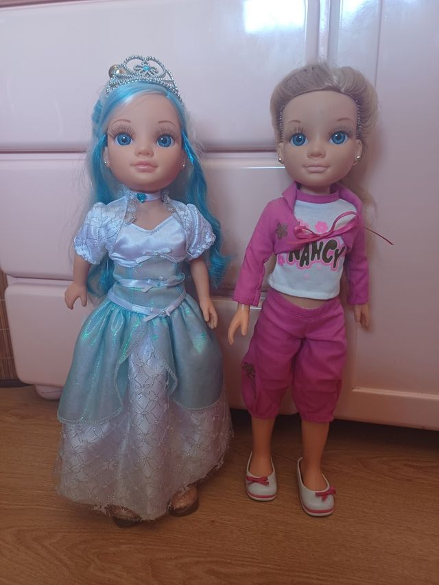 Detalles del productoDos muñecas Nancy, una vestida de princesa y otra con ropa deportiva.
