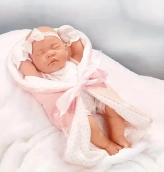 Detalles del productoBebé viene envuelto en una suave manta rosa con detalles de topitos y un lazo a juego. Incluye las manoplas y mide 29cms.
