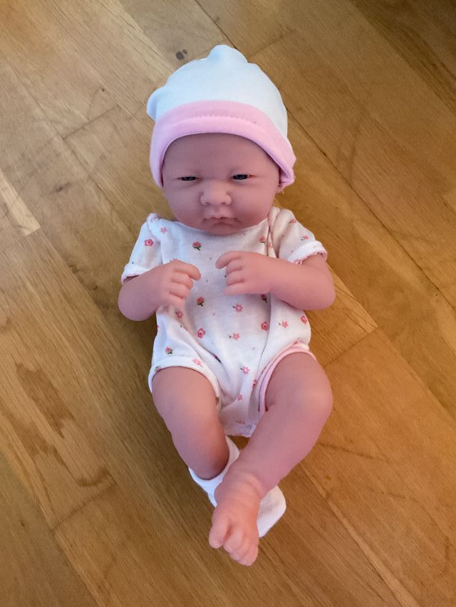 Muñeco de bebé con un conjunto de ropa incluido. Ideal para coleccionar o jugar. - Conjunto de ropa con estampado floral. - Gorrito a juego.