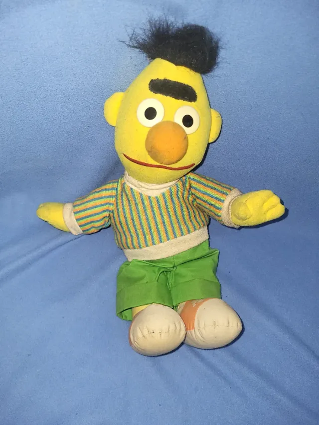 Este es un muñeco de Bert de Plaza Sésamo. - Muñeco de peluche. - Ropa a rayas y pantalón verde.