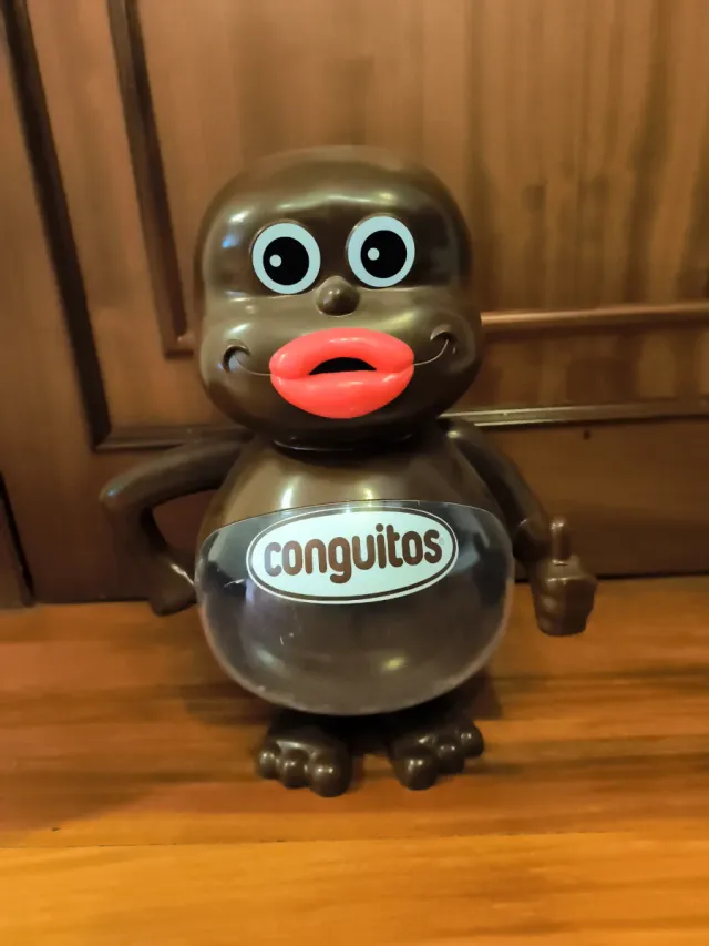Figura coleccionable de Conguitos. - Diseño divertido con labios rojos y ojos grandes. - Cuerpo marrón. - Etiqueta Conguitos en el abdomen. - Tiene algunos rayazos en el abdomen.