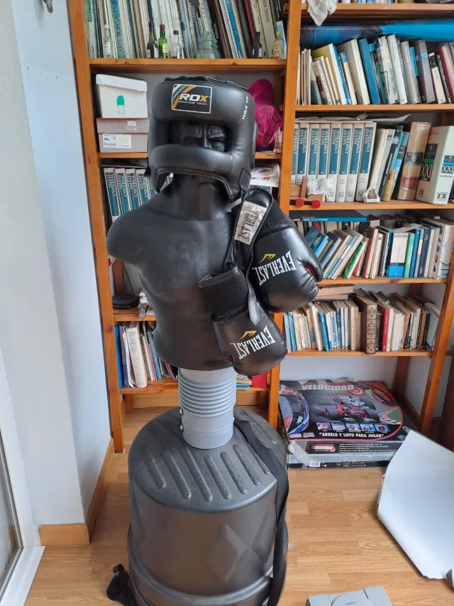 Muñeco de entrenamiento de boxeo con casco y guantes. - Marca RDX en el casco. - Guantes de la marca Everlast. - Base de pie para mayor estabilidad.