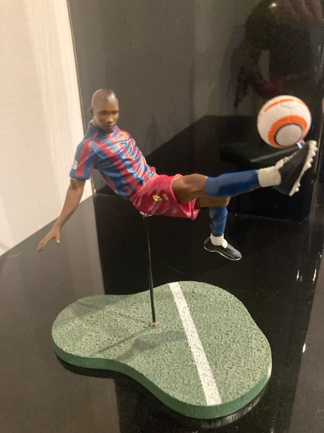 Figura de colección del futbolista Samuel Eto'o en acción. - Réplica detallada del jugador. - Base temática de campo de fútbol.