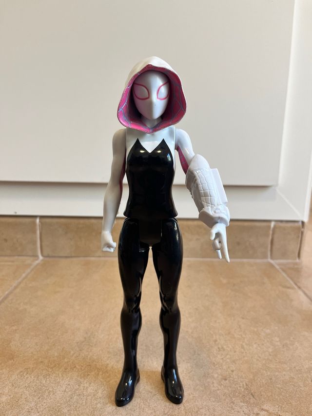 Figura de acción de Spider Woman con capucha. - Mide 30 cm de altura. - Diseño clásico en blanco, negro y rosa. -contienen ranura para escudos.