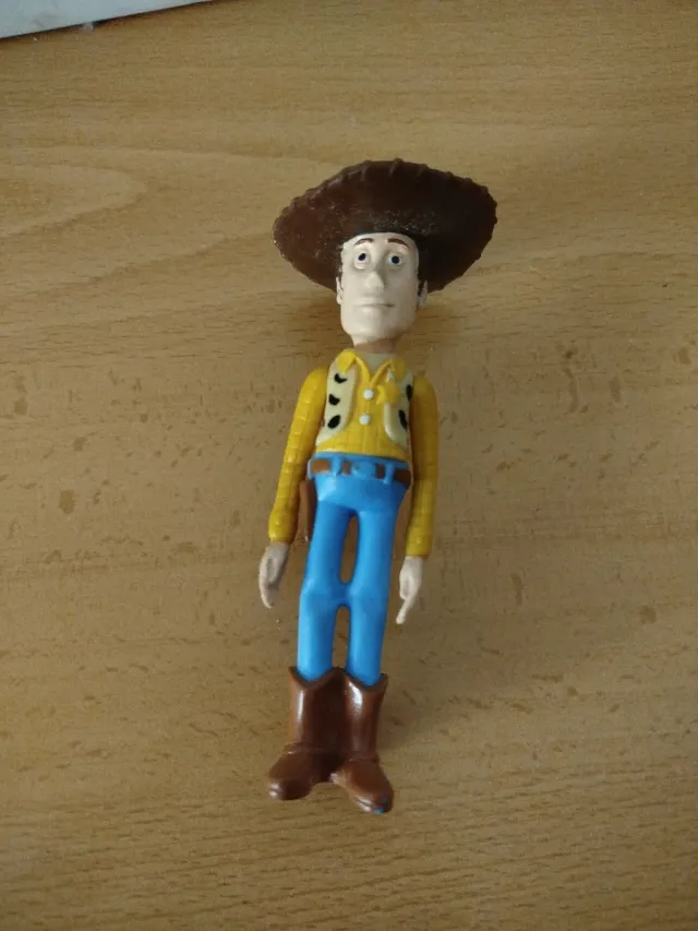 Figura del personaje Woody de Toy Story, fabricada en 1999. - Diseño clásico del vaquero. - Ropa detallada con su característico chaleco y sombrero.