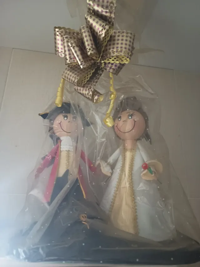 Detalles del productoSet de muñecos decorativos de novios, ideales para bodas o como regalo especial. Presentados en un envoltorio transparente con un gran lazo.