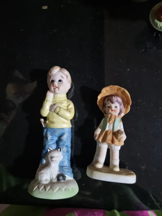 Detalles del productoConjunto de dos figuras de porcelana, un niño con un gato y una niña con sombrero.