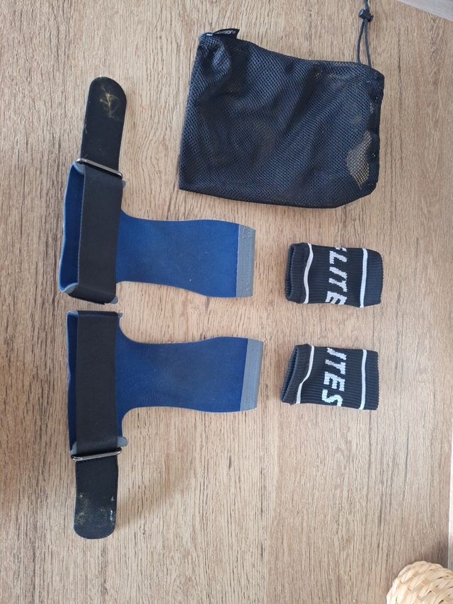 Detalles del productoMuñequeras de la marca Velites, talla M, diseñadas para la práctica de CrossFit. Incluyen una bolsa de malla para guardarlas.