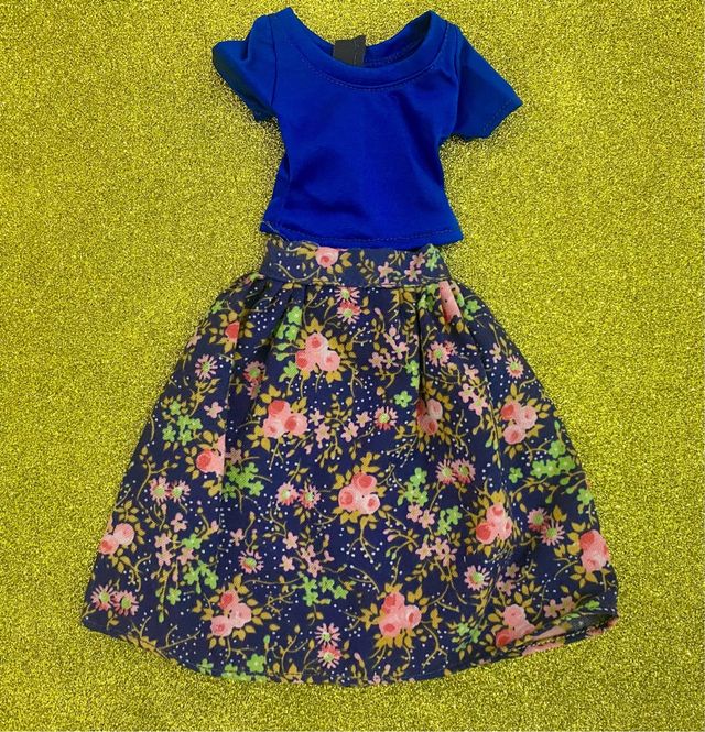 Conjunto de ropa para muñeca Nancy, años 70 original. - Camiseta de manga corta en color azul. - Falda con estampado floral sobre fondo azul marino.