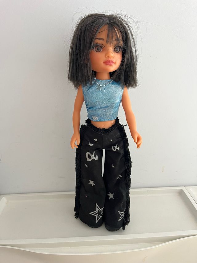 Muñeca Nancy Aitana con un conjunto moderno. - Top azul brillante. - Pantalones negros con estrellas y flecos.