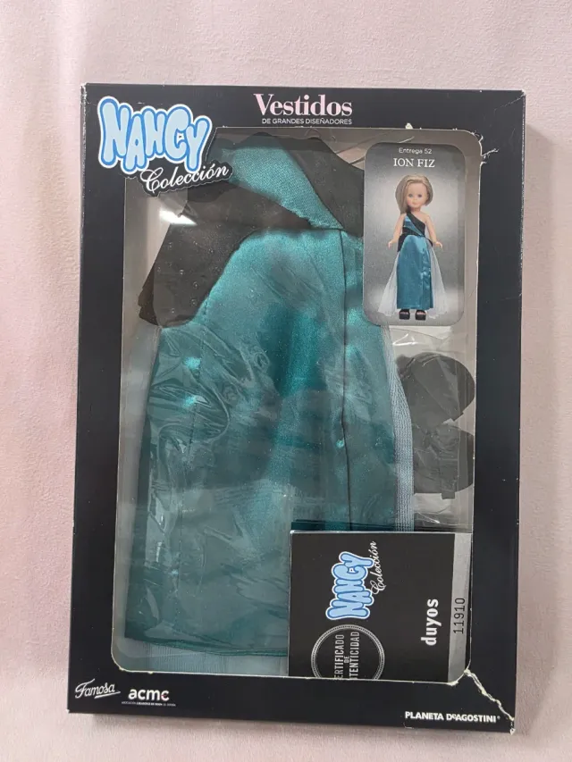 Este set de Nancy Colección presenta el vestido Ion Fiz, entrega 52. - Vestido de diseñador. - Incluye muñeca. - Certificado de autenticidad.