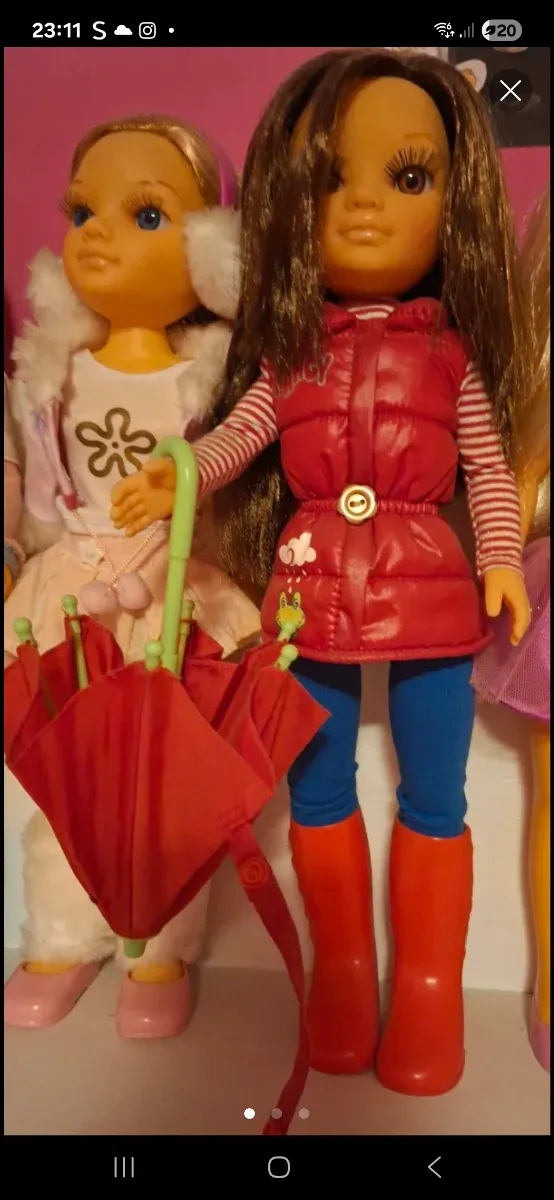 Muñeca Nancy con temática de lluvia, lista para jugar. - Incluye un paraguas rojo. - Botas de agua. - Vestimenta a rayas y chaleco acolchado.