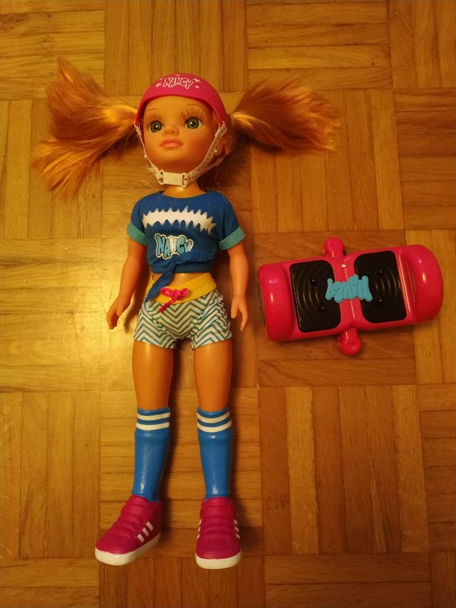 Detalles del productoNancy, Un día con mi Hoverboard, es la Nancy deportista más a la moda y divertida. Tiene un hoverboard rosa que funciona de verdad. Se mueve hacia delante y hacia atrás, y lo más alucinante es que puede dar giros 360º, además de tener un sensor de obstaculos. Nancy con coletas pelirrojas lleva un moderno look de patinadora con un casco y zapatillas rosas a juego con el que las niñas pasarán horas divirtiendose. La muñeca se puede separar del hoverboard.