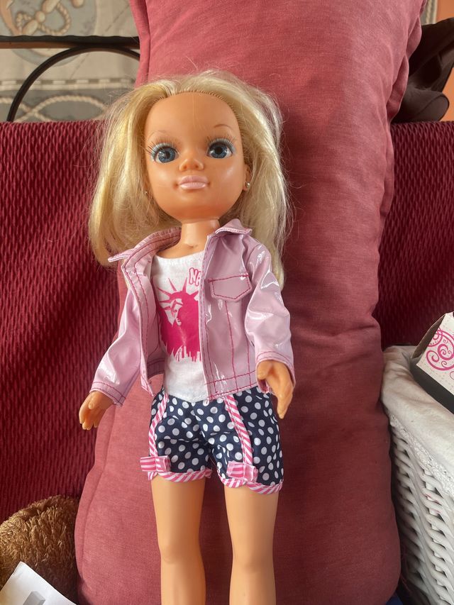 Muñeca Nancy con un conjunto de ropa de verano. - Chaqueta rosa brillante. - Camiseta blanca con estampado. - Pantalones cortos de lunares azul marino con volantes rosas.