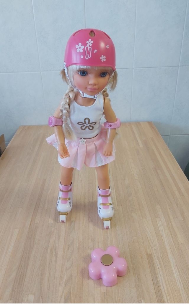 Detalles del productoMuñeca Nancy vestida de patinadora, lista para la acción.