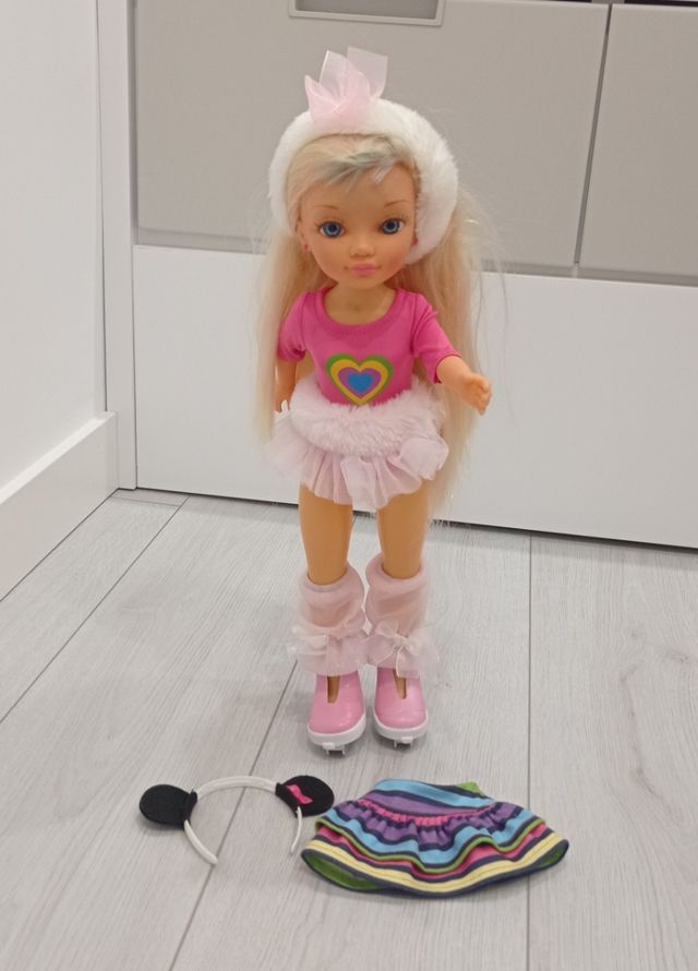 Muñeca Nancy con patines de hielo y accesorios. - Incluye diadema con orejas. - Falda de colores. - Patines rosas con ruedas.