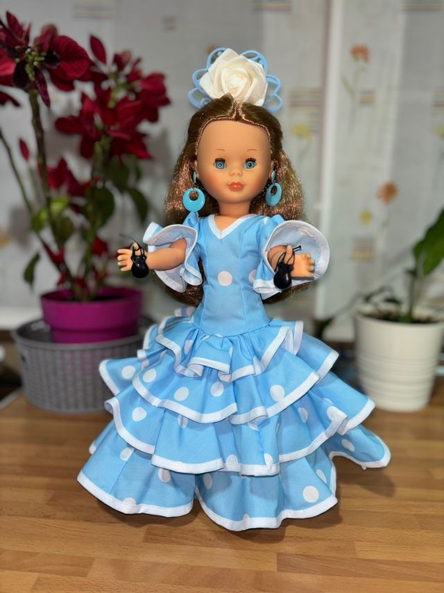 Detalles del productoPreciosa muñeca Nancy clásica reedición en perfecto estado vestida de Flamenca o Faralaes con traje confeccionado artesanalmente ideal para el Rocío. Es una preciosidad de ojos azules y melena rubia cerveza. Lleva un precioso vestido de Flamenca en color azúl clarito con complementos a juego, peineta, flor, pendientes, castañuelas y zapatos a juego. Precio 95€. Envío aparte. Pago por Caixa, Bizum, Wallapay o PayPal amigos.