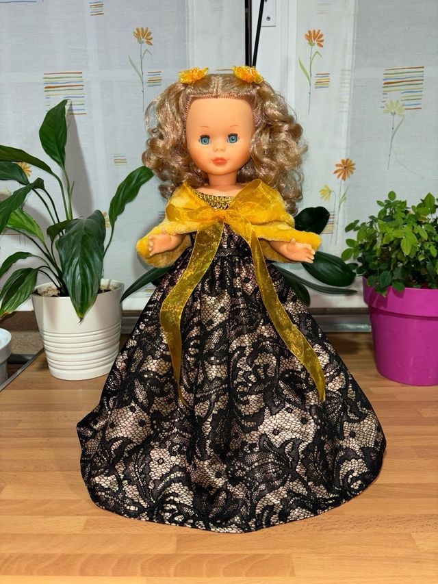Detalles del productoPreciosa muñeca Nancy reedición en perfecto estado con un maravilloso vestido de fiesta artesanal de encaje negro sobre fondo dorado, estola, adornos del pelo y zapatos a juego. Es una maravilla ideal para cualquier fiesta. Posibilidad de comprar el traje por separado si se quiere, pregunta precio. Envío aparte.