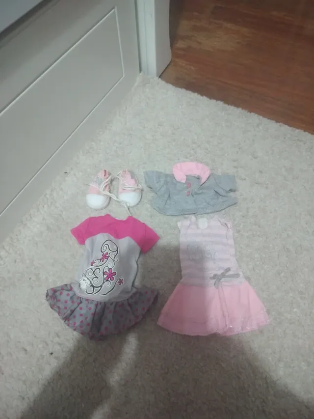 Conjunto de ropa y zapatos para muñeca Nancy. - Vestido rosa y gris con estampado. - Conjunto gris con cuello rosa. - Zapatos deportivos rosas (ESTÁN BASTANTE USADOS).