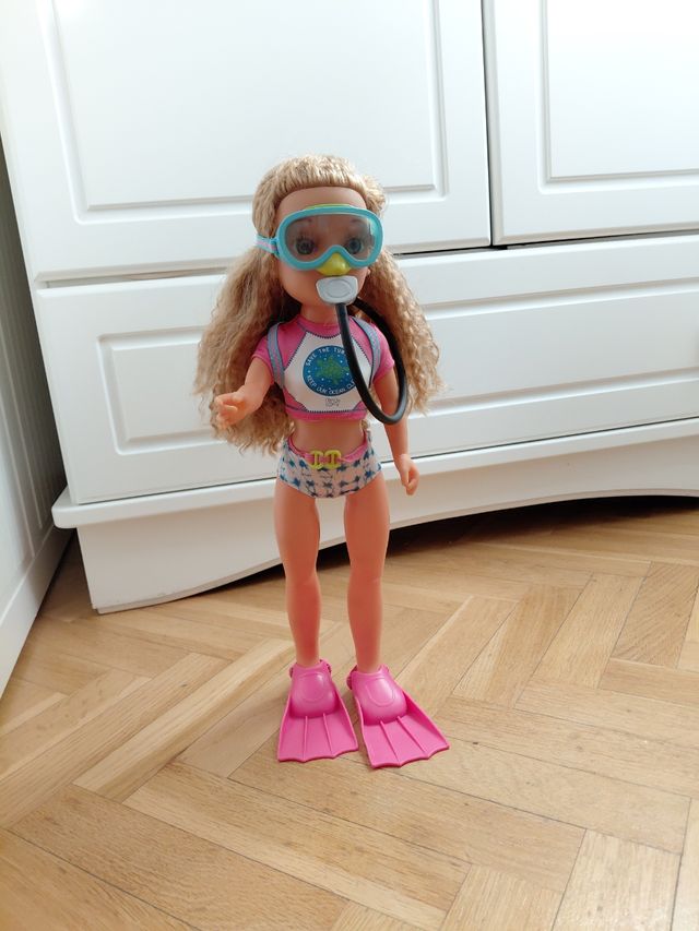 Muñeca Nancy Un día salvando tortugas. - Incluye equipo de buceo completo con gafas y tubo. - Traje de baño con estampado de tortugas. - Aletas de buceo rosas.