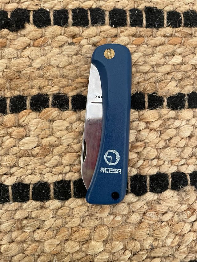 Navaja de corte con mango azul y hoja de acero inoxidable. - Marca: ACESA - Material de la hoja: Acero inoxidable - Color del mango: Azul -sierra y pela cables