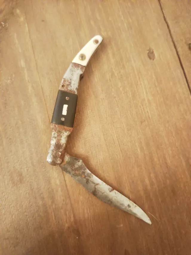 Navaja antigua con detalles en negro. Presenta signos de óxido, lo que le da un carácter único.