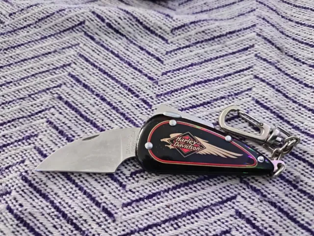 Detalles del productoPequeña navaja con diseño de Harley Davidson, ideal para llevar como llavero.