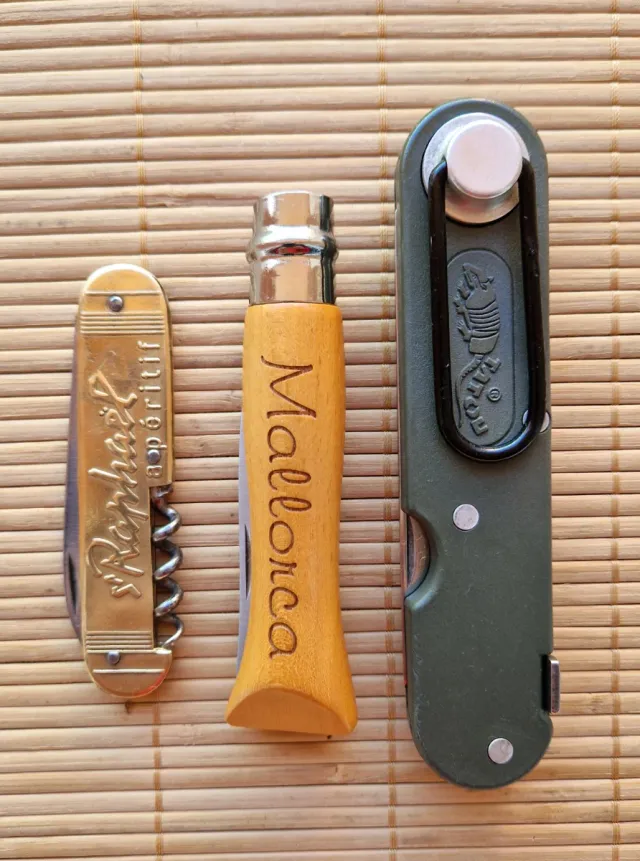 Detalles del productoLote de tres navajas , la Tatou fue distribuida en algunos cuerpos militares de Francia 9 '5 cm , la tipo opinel es copia 8cm , la dorada es de publicidad vintage francesa 7 cm .