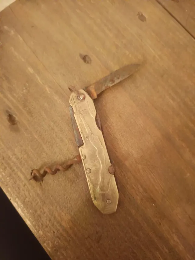 Navaja multiusos de estilo vintage, con un diseño clásico y funcional. - Hoja de metal con signos de óxido. - Mango de latón con remaches. - Incluye sacacorchos.