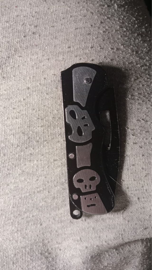 Navaja negra con un diseño llamativo de calaveras. - Mango con incrustaciones metálicas. - Detalle de calaveras y rostros. - Anilla para llavero o cordón.