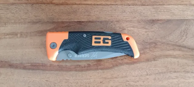 Navaja plegable con mango de goma y detalles en naranja. - Hoja de acero inoxidable. - Mango ergonómico. - Logo BG grabado.