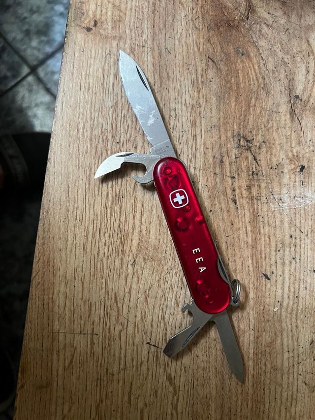 - Incluye varias herramientas: cuchillas, abrelatas, sacacorchos, etc.
