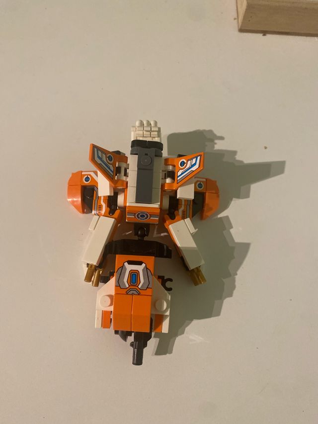 Nave espacial construida con piezas LEGO, de color naranja y blanco. - Diseño futurista. - Detalles en azul y gris.