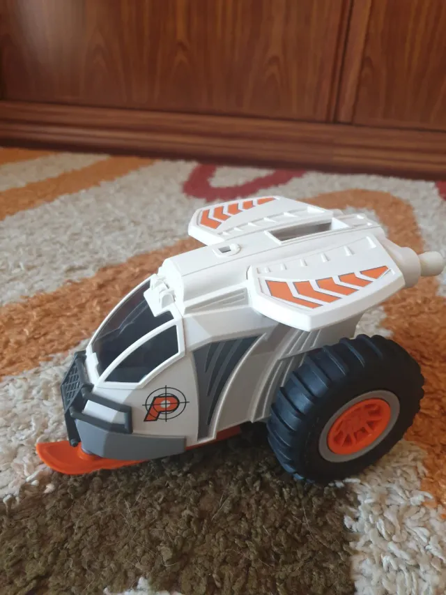 Nave de juguete de Playmobil con diseño futurista y detalles en naranja. - Ruedas grandes todoterreno. - Detalle de logo en el lateral. - Base delantera tipo esquí.