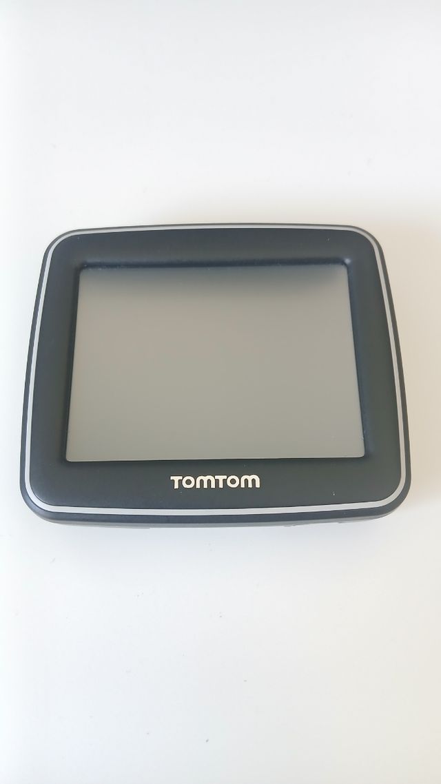 Navegador GPS TomTom con pantalla. - Diseño elegante en color negro. - Marco plateado alrededor de la pantalla.