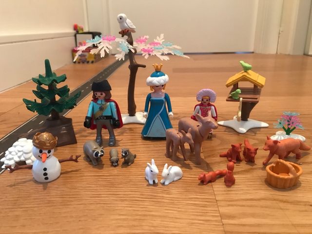 - 3 personajes: dama o reina del hielo, principe, y niña princesa con precioso gorro y patines. Y un muñeco de nieve con corona.