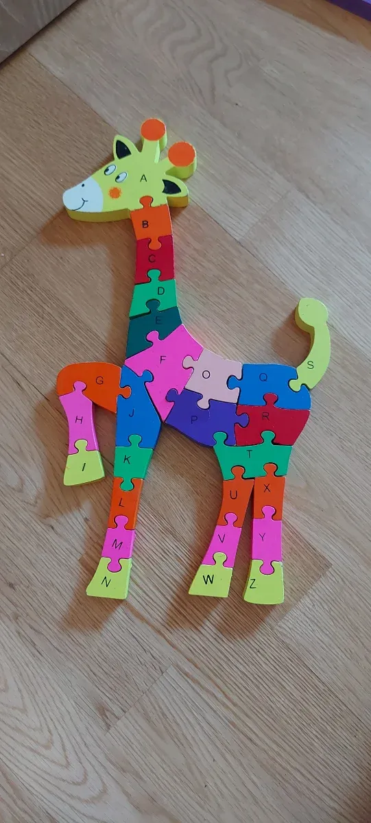 Detalles del productoDivertido puzzle de madera con forma de jirafa, ideal para aprender el abecedario.
