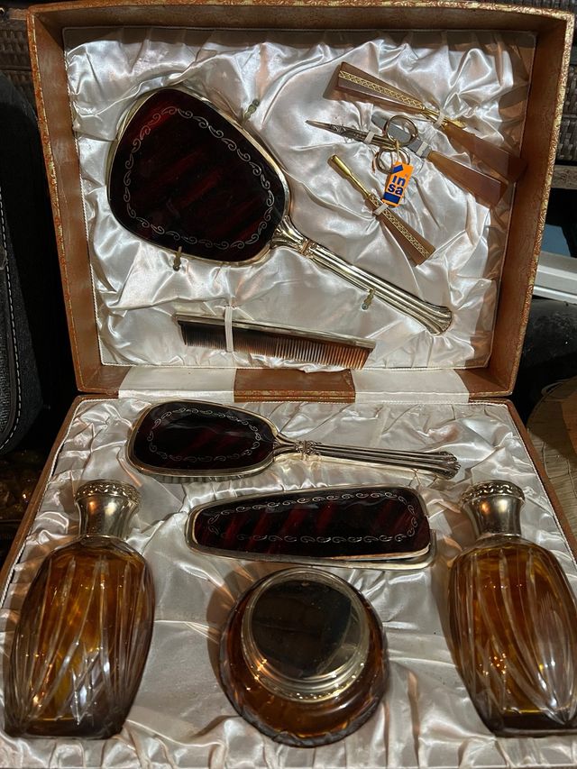 Detalles del productoElegante neceser vintage con varios accesorios para el cuidado personal. El interior está forrado en satén blanco.