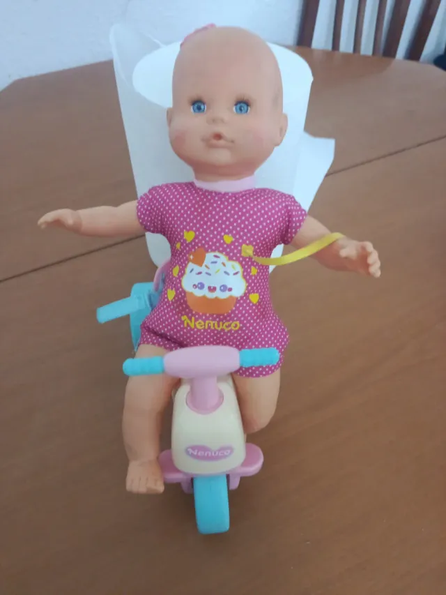 Detalles del productoMuñeca Nenuco sentada en su triciclo rosa y azul.