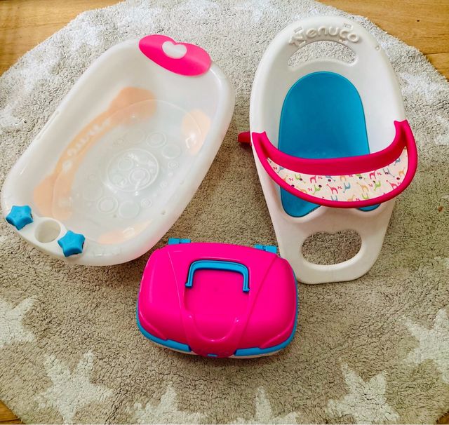 Detalles del productoSet de accesorios para bebé de la marca Nenuco, que incluye una trona, una bañera y un maletín.
