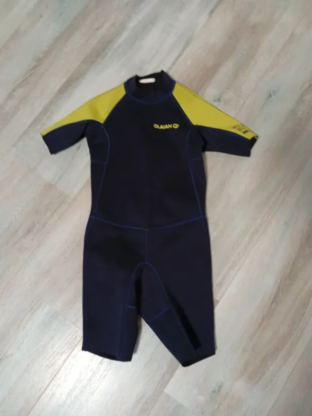Traje de neopreno corto para niño de la marca OLAIAN. - Color azul marino y amarillo. - Mangas cortas. - Piernas hasta la rodilla.