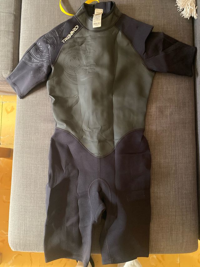 Neopreno corto de la marca Tribord, talla M. Apenas ha sido utilizado. - Color principal gris oscuro y negro. - Mangas cortas. - Piernas hasta medio muslo.