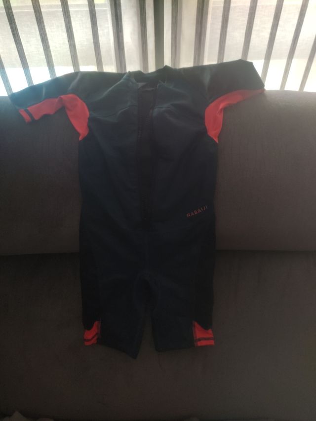 Detalles del productoNeopreno de manga corta y pernera corta para niños, ideal para actividades acuáticas. Presenta un diseño en color azul marino con detalles en naranja en las mangas y en los bajos de las perneras.Muy poco uso