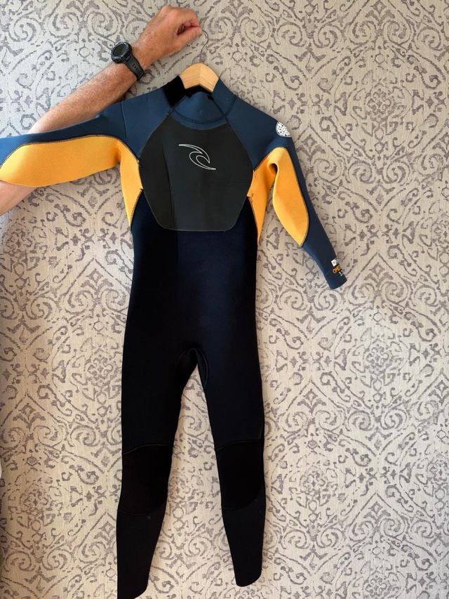 Neopreno de manga larga para niño, ideal para deportes acuáticos. - Color azul marino, negro y amarillo. - Cierre de cremallera frontal. talla 12