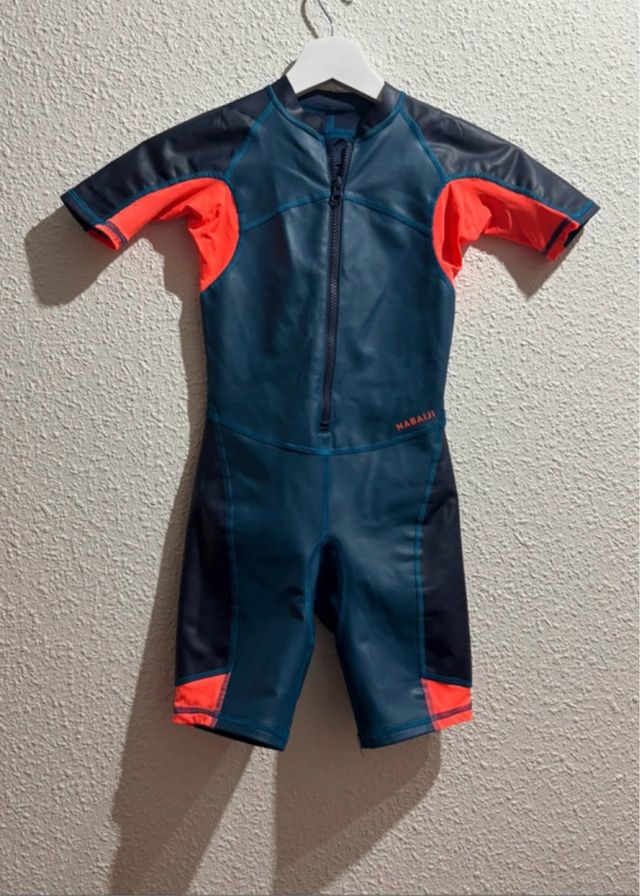 Detalles del productoTraje de neopreno corto para niño de la marca Nabaiji, ideal para actividades acuáticas.