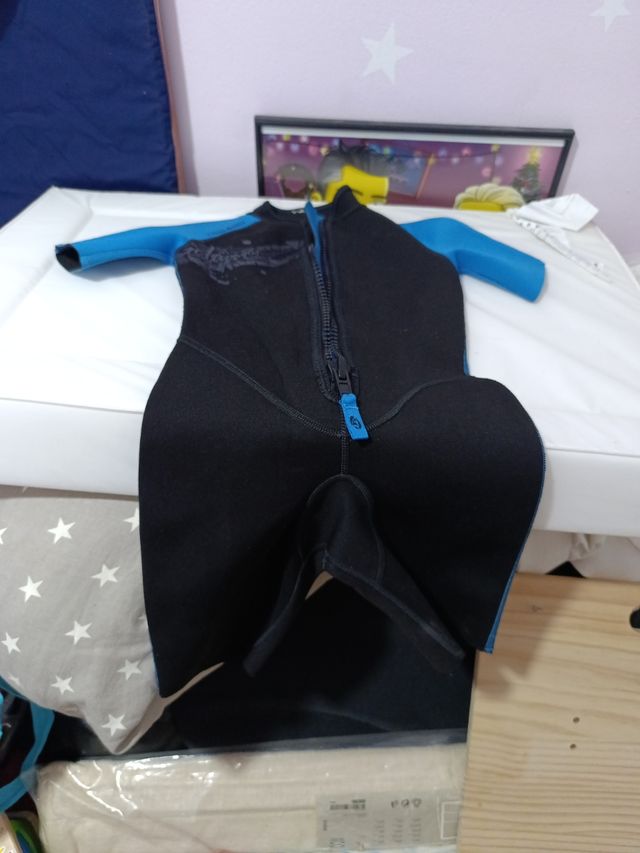 Traje de neopreno para niñ@, talla 5-6 Está en buen estado, ideal para actividades acuáticas. - Color azul y negro. - Cremallera frontal. - Manga corta.